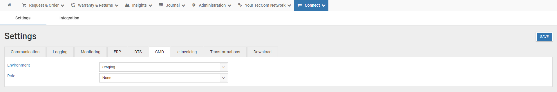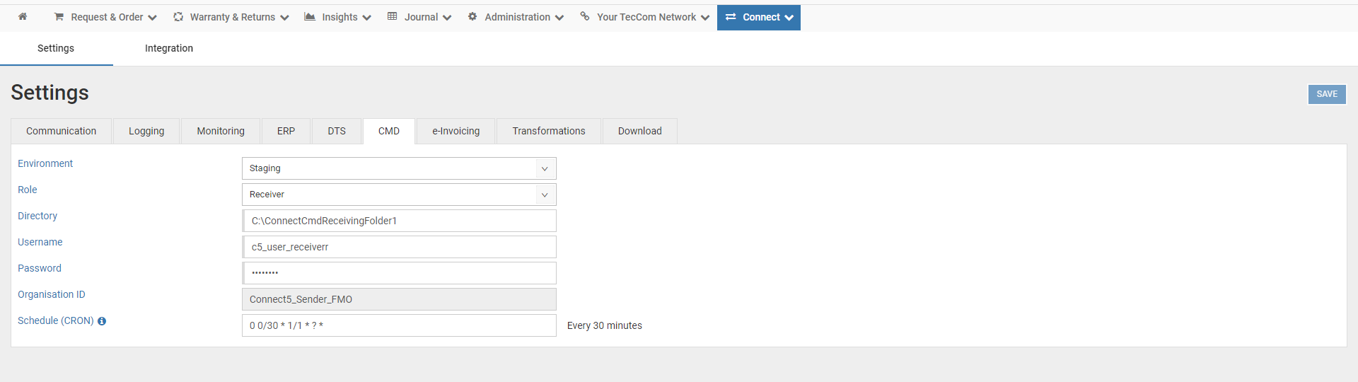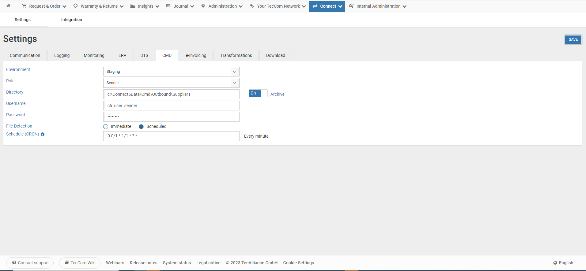 CMD section allows to configure Connect to transfer articles and price data from the parts manufacturer to the CMD Platform (platform) and data transfer from the platform to a trading company. It is required that the TecId is assigned to an organization in Solution Portal in order to use Connect to send or receive CMD files.