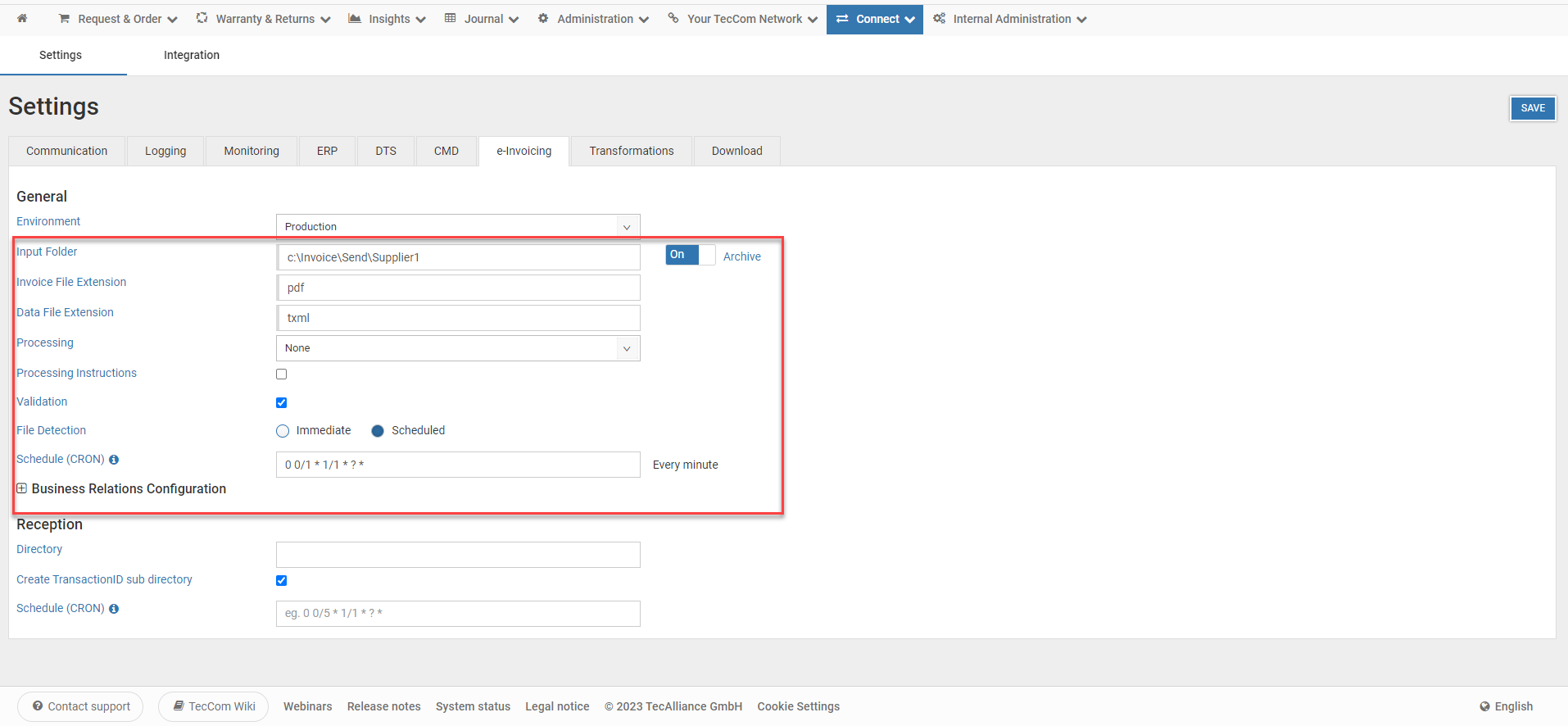 This section allows a supplier to activate the connection with TecCom Business Cloud, configure settings to upload data to TecCom Business Cloud, and receive article orders from buyers.