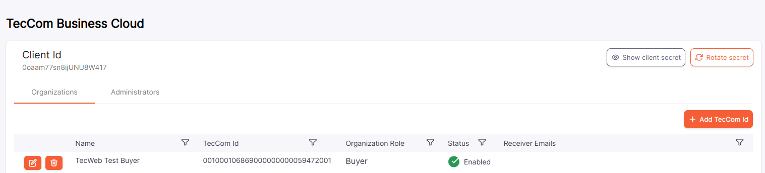 You can also add more administrators to this client. This client administrator can also retrieve the secret or rotate the secret, add, edit or remove organizations (with TecCom organization administration rights) or add more client administrators.