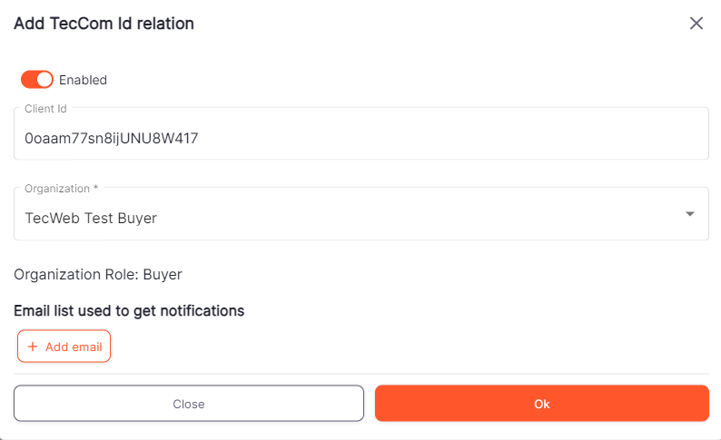 Now you can add all to your assigned supplier organizations, where you have** TecCom organization administration rights**, to this client. After adding organizations you are allowed to send data with this client.